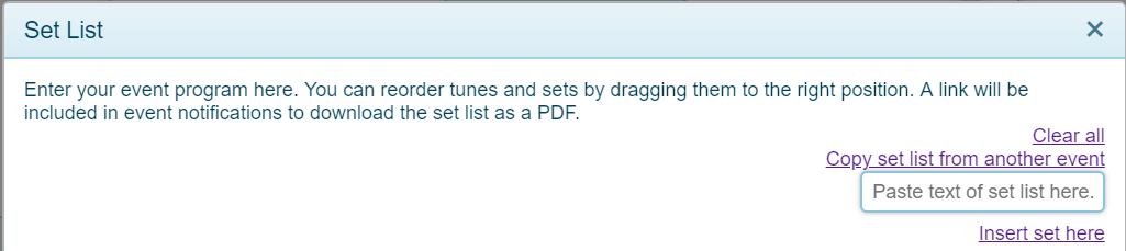 For convenience, you can copy and paste set lists from text. The text needs to be in a specific format, a tune per line, with quotes around the title and a comma separating the title from the composer/arranger, such as: