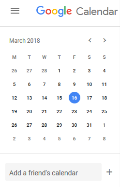 Open Google Calendar. On the left, click the + sign on the left beside "Add a friend's calendar":