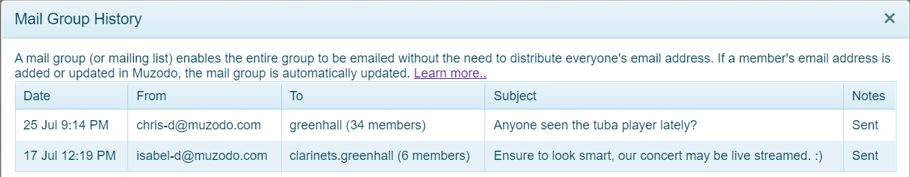 Muzodo enables you to review a list of email that has been sent to your group mail.