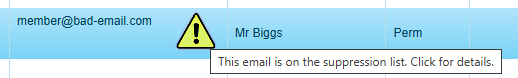 To see if a member is on the suppression list, as an admin, log into the webapp, open the Members tab and find their name (or use the filter to search for them). If they have a big yellow warning sign next to their email address, they're on the suppression list.