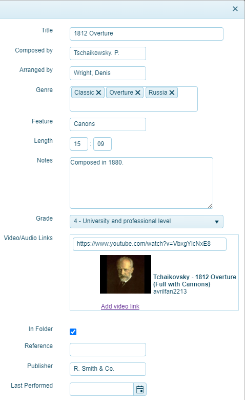 • Last Performed: Feel free to add this if you have it. It will be filled in automatically if you include this piece in a set list.