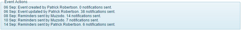 Below that are the actions taken for this event which include when the event was created in Muzodo, when it was updated, reminders sent, etc.